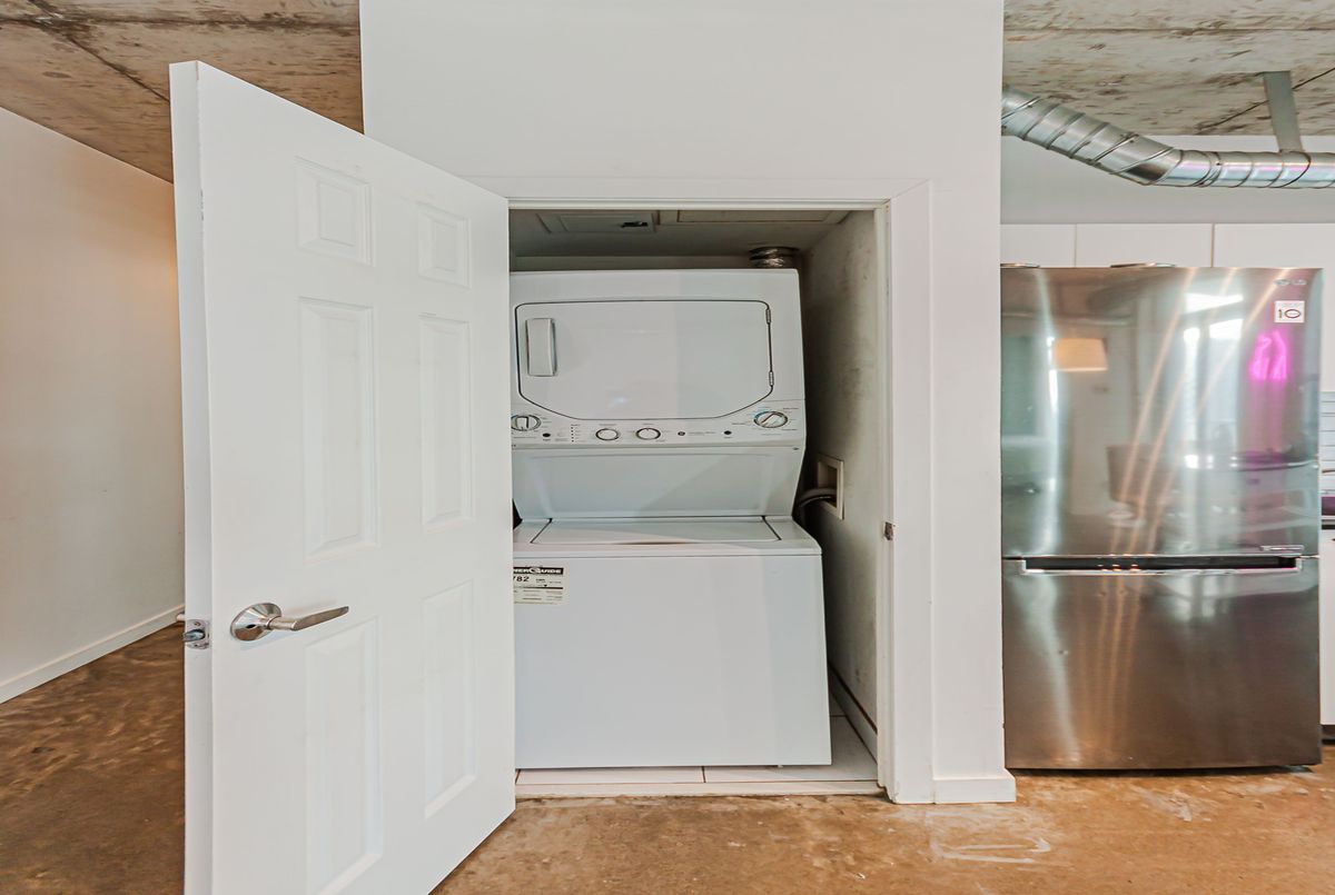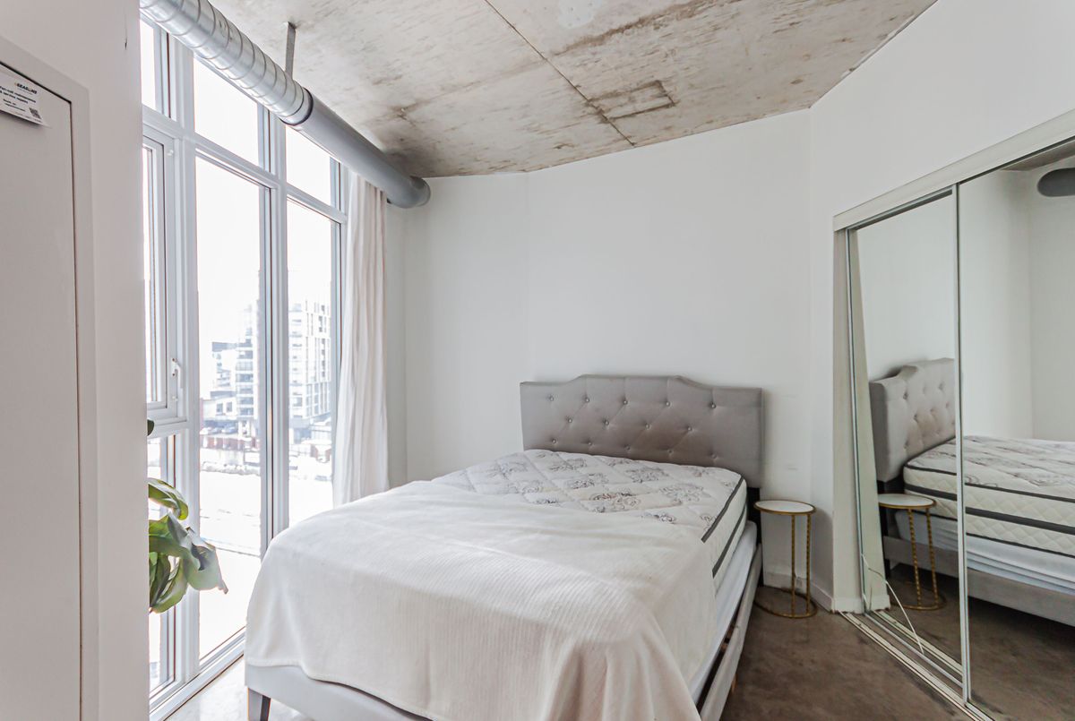 Bright and airy soft loft with polished concrete floors, exposed ceilings, and expansive floor-to-ceiling windows creating a striking industrial aesthetic. Open-concept living space flows seamlessly to a private balcony with lake views. Quiet suite with a desirable split two-bedroom layout, both bedrooms offering windows, closets, and abundant natural light. Updated with stainless steel appliances.Offered partly furnished for added convenience. Live in the heart of vibrant Queen West and enjoy excellent amenities, including a gym and pool. Parking and Locker included.
