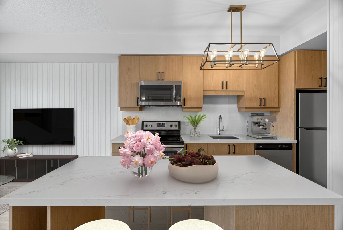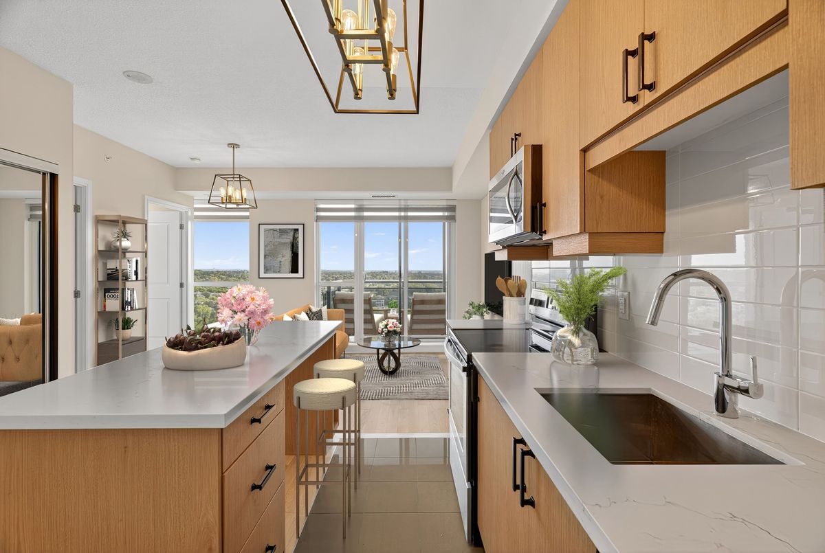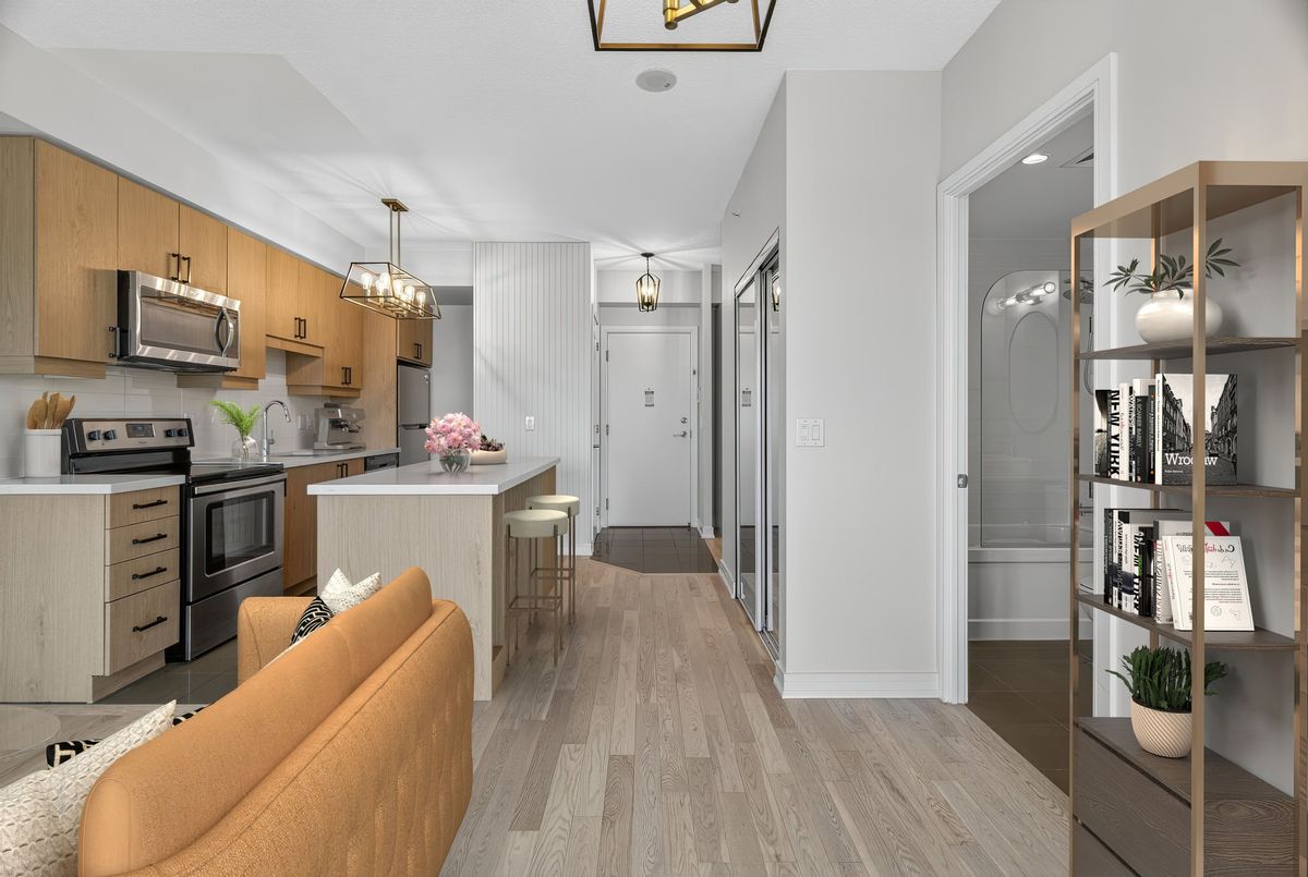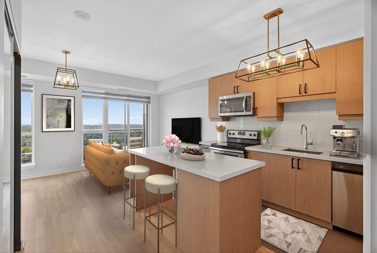Welcome To Beverley Hills Condos, Where Elegance, Design, And Lifestyle Converge In The Heart Of Richmond Hill. Nestled High On The 16th Floor, This 1 Bedroom + Den, 1 Bathroom Residence Has Been Fully Renovated And Reimagined To Offer A Seamless Blend Of Modern Luxury And Everyday Functionality. With 614 Sq Ft Of Interior Living Space Plus A 50 Sq Ft Balcony, Every Detail Has Been Curated To Inspire Sophistication. Wake Up In An Extended Primary Suite Wrapped In Windows, Where Natural Light Floods The Room And Custom Built-In Closets Keep Your Life Beautifully Organized. Step Into A Spa-Inspired Bathroom Featuring A Deep Soaker Tub, Glass Partition, Chic Vanity, And Designer Fixtures That Elevate Every Routine. The Heart Of The Home Is A Chefs Kitchen Finished With Imported Ceramic Tiles, Sleek Stainless Steel Appliances, Refaced Cabinetry, And A Stunning Double-Edged Quartz Island That Invites Conversation, Entertaining, And Quiet Mornings With Coffee. The Open-Concept Design Flows Effortlessly Into The Living And Dining Areas, Creating A Bright, Airy Atmosphere Framed By Unobstructed East-Facing Views That Stretch Across The Natural Beauty Of Richmond Hill. The Versatile Den Adapts To Your Lifestyle A Private Home Office, A Workout Space, Or Even A Chic Nursery For A Growing Family. Designer Lighting, Accent Walls, And Soaring 9' Ceilings Tie The Space Together With Timeless Style. Life At Beverley Hills Condos Extends Beyond Your Suite. Indulge In Resort-Inspired Amenities: Indoor/Outdoor Pool, Rooftop Lounge, Yoga Studio, State-Of-The-Art Gym, Movie Theatre, Party Rooms, And Lush Courtyard. With 24/7 Concierge And Security, Visitor Parking, And Unbeatable Proximity To Shopping, Dining, Top Schools, Transit, And Trails, This Is More Than A Home Its A Lifestyle.