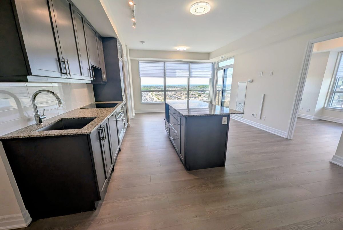 Beautiful and Spacious 2-Bedroom Corner Unit with Panoramic West-Facing Views. This large suite offers a well-designed layout with 9-foot ceilings, abundant natural light from large windows, and premium finishes throughout. Enjoy an open-concept kitchen featuring sleek, built-in modern appliances. The primary bedroom includes a walk-in closet and a stylish ensuite bathroom. With two full bathrooms and generous living space, this unit combines comfort and functionality. Ideally situated in a prime central location close to shopping, dining, schools, entertainment, hospital ,Hwy 400, and public transit. Includes one parking space and a locker for added convenience. One Underground Parking Spot And One Storage Locker Included.