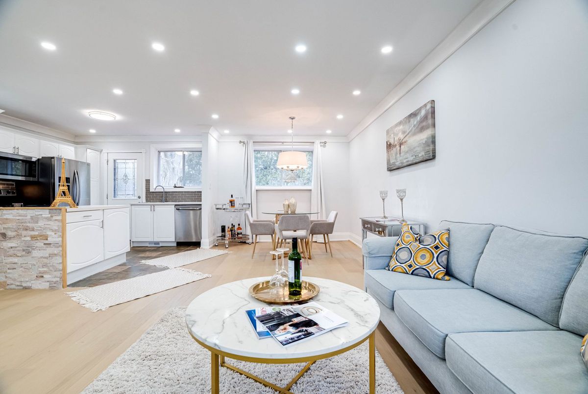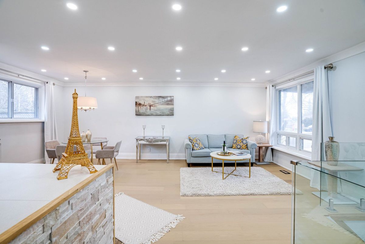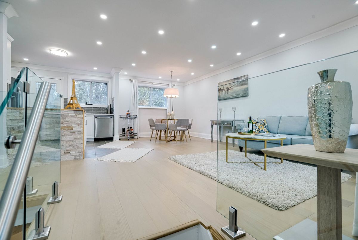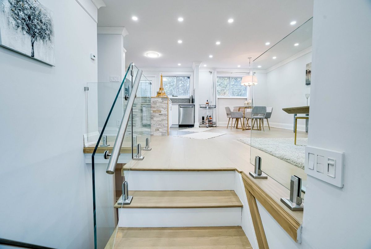 Beautifully renovated in 2022, this must-see solid brick bungalow offers an open-concept layout on a premium 70-ft wide, fully fenced, pool-size lot surrounded by mature trees for exceptional privacy and great potential for future development. Extensive 2022 upgrades include engineered hardwood floors, pot lights, glass and stainless-steel railings, paint, solid wood crown moulding and trim. The updated kitchen features stainless-steel appliances and a walk-out to a large deck-ideal for entertaining. The main level offers two spacious bedrooms (formerly three and easily convertible back) and a 3-piece bath. The finished lower level includes three additional bedrooms/ plumbing rough-ins for potential kitchen in the lower level and a 3-piecebath.