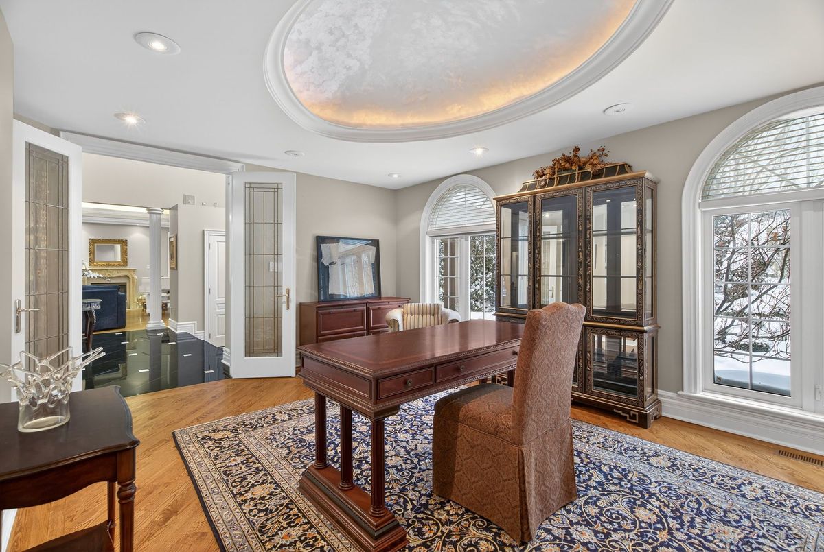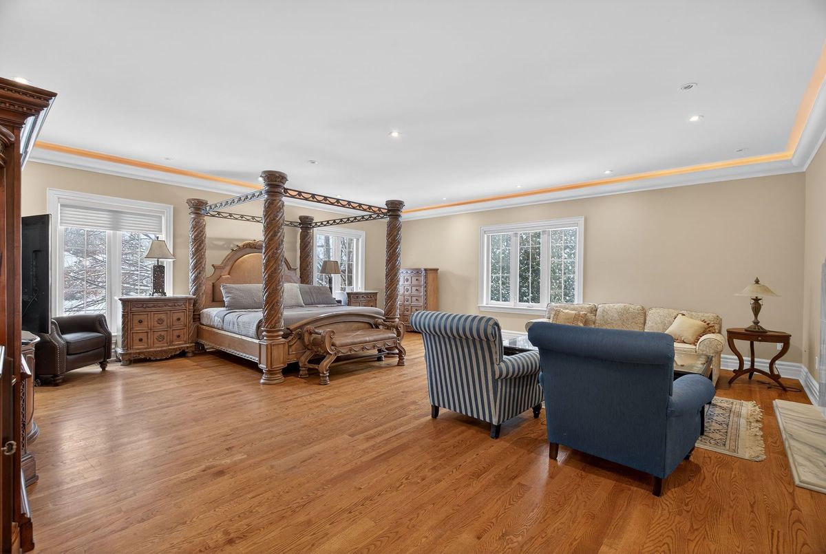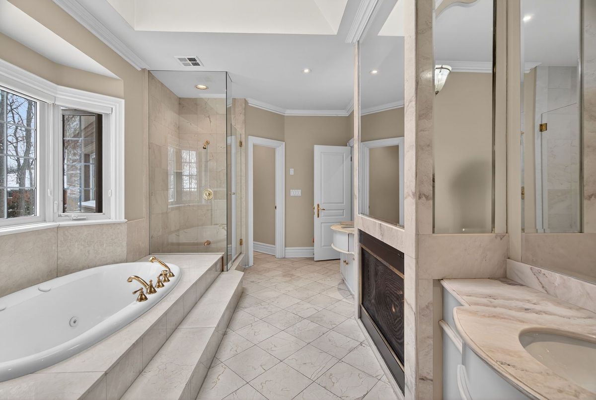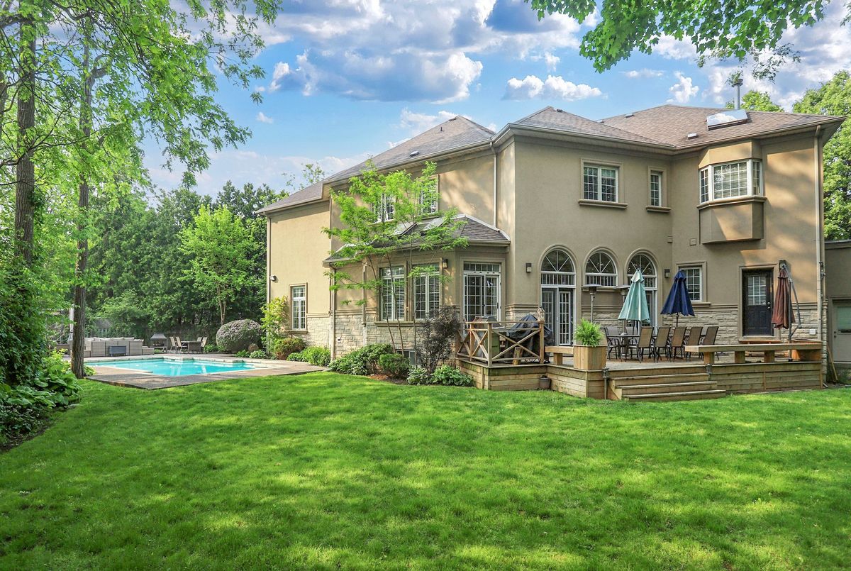 Welcome to 161 Renaissance Court, an exceptional and truly rare offering on a quiet, private cul-de-sac recognized as one of the most prestigious streets in Thornhill and the entire GTA. Custom-built to the highest standards of craftsmanship, this grand residence sits on one of the largest irregular, pie-shaped, fully treed lots in all of Thornhill, boasting over 228 feet of width at the rear and offering remarkable privacy and scale. With approximately 10,000 sq. ft. of living space (6,650 sq. ft. above grade plus a 3,141 sq. ft. finished basement), the home features 5 spacious bedrooms and 7 bathrooms, soaring 10-foot ceilings on the main level, a dramatic cathedral foyer with picture window glass entry, and two main-floor washrooms. Designed for both luxury and functionality, the expansive layout includes a potential main-floor in-law suite, a second service staircase, open-concept principal rooms, and quality finishes throughout, including 8-foot solid doors, granite floors, and a massive chef's kitchen with an oversized island. The sun-filled southwest-facing backyard is a true private retreat, highlighted by a spectacular in-ground swimming pool, spill-over hot tub and spacious Cabana/change room, surrounded by mature trees-perfect for entertaining and family living. Completing the home are a three-car garage, circular interlocked driveway, and an unbeatable location ideal for large families looking to raise their children in Thornhill's most sought-after community, just a short walk to Westmount Collegiate Institute, Chabad Flamingo, and close to top-ranked French Immersion and Arts programs, offering an unmatched combination of space, privacy, luxury, and lifestyle.
