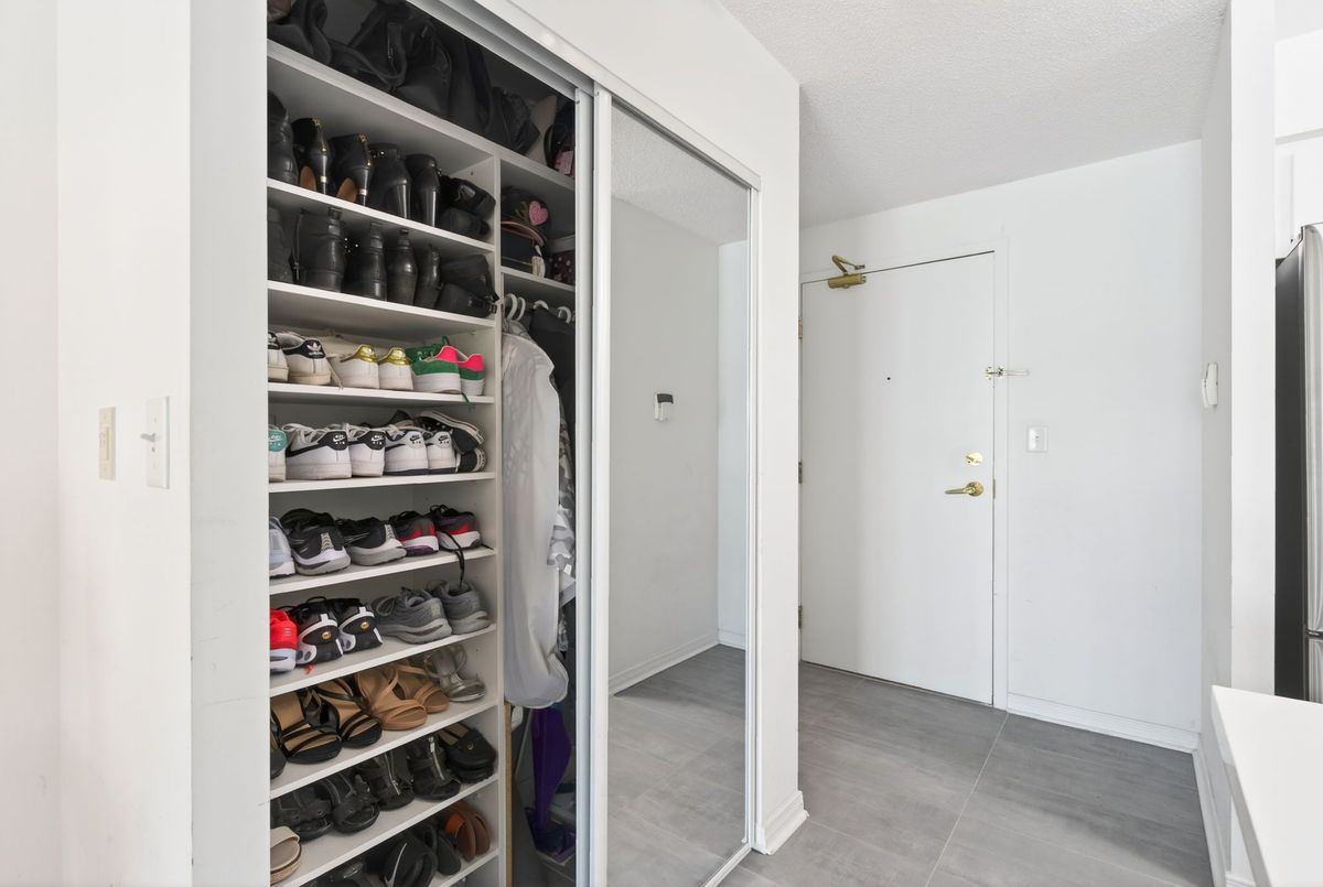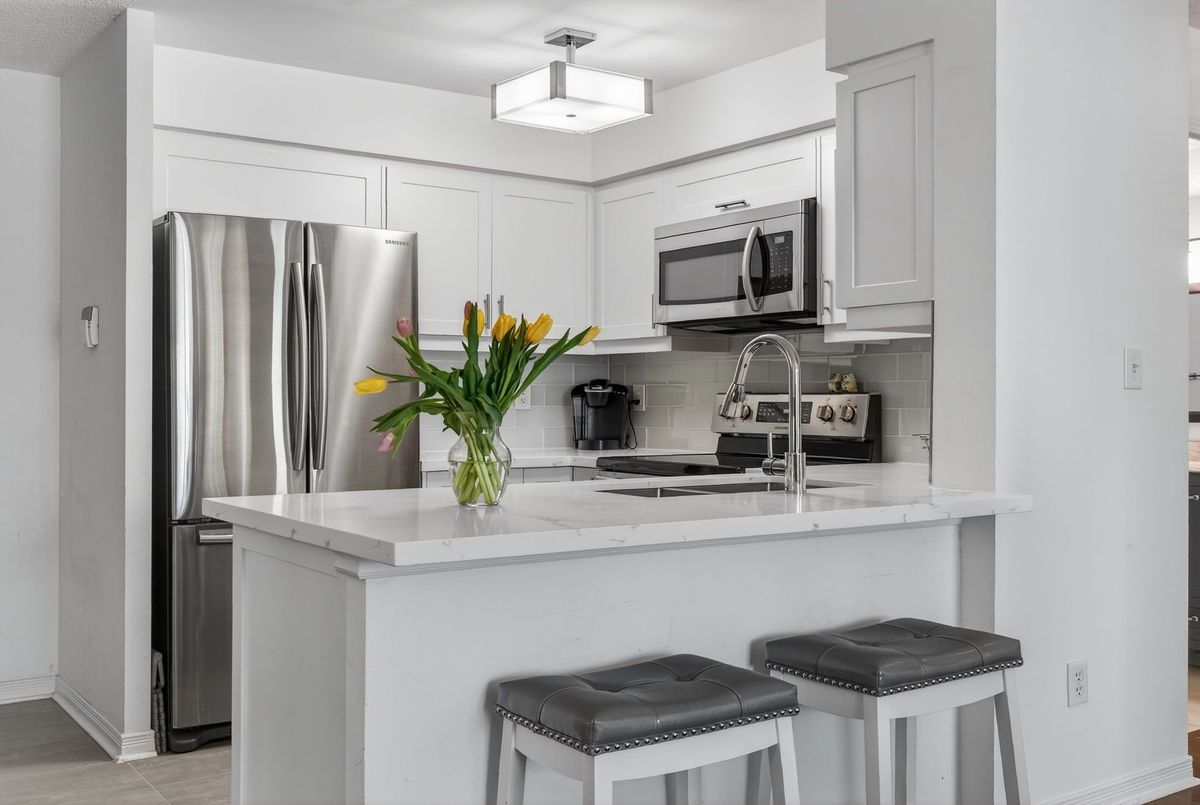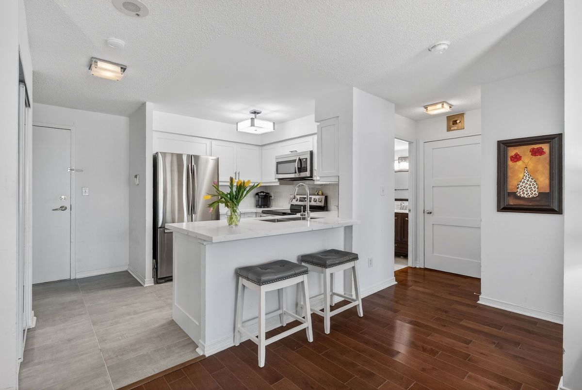 Welcome to this beautifully updated, spacious open-concept 1-bedroom, 1-bathroom suite offering comfortable and modern living at its finest. This stunning home features a beautifully updated custom kitchen renovated from top to bottom, showcasing gorgeous custom cabinetry, sleek quartz countertops, stainless steel appliances, and ceramic flooring throughout the kitchen area. The open-concept layout flows seamlessly into the bright and inviting living and dining areas, perfect for entertaining or relaxing in comfort.Engineered hardwood flooring runs throughout the suite, adding warmth and a seamless flow from room to room. The large primary bedroom offers generous space and features an oversized closet, providing plenty of storage. A convenient shoe closet at the entry adds practical storage and helps keep the space organized and clutter-free. Enjoy premium building amenities including a newly updated fitness facility, 24-hour security, and concierge service for added convenience and peace of mind. Ideally located within walking distance to shops, restaurants, and public transit, this home offers the perfect blend of style, comfort, and accessibility.