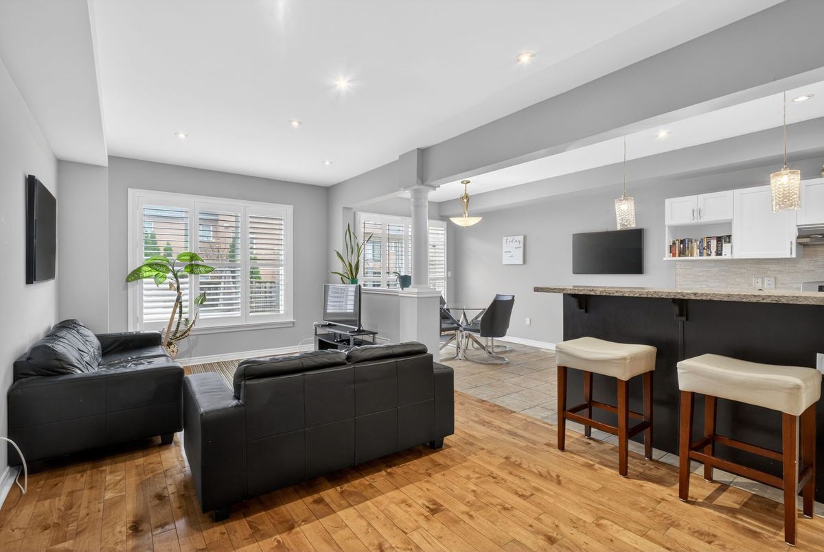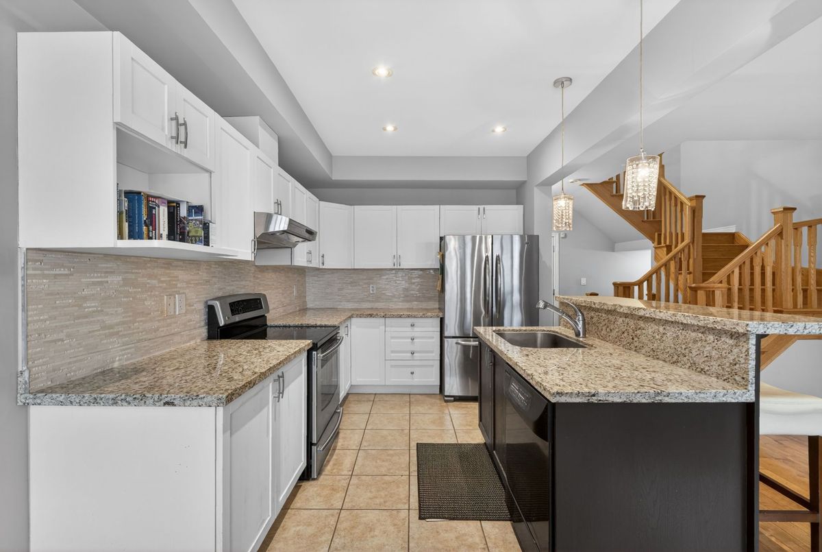 Charming townhome in high demand Valleys of Thornhill, conveniently located near community centre, public park, and fantastic schools. Sun-filled home features open concept main floor, with large principal rooms and superb flow of layout. Chef's kitchen designed with excellent use of space, boasting stainless steel appliances and additional seating at breakfast bar. Direct entry from garage to main floor. Finished basement offers additional space for family room and/or office, with a large storage area as well. Backyard features a stone slab patio, with north facing lot providing sun in the backyard all day.