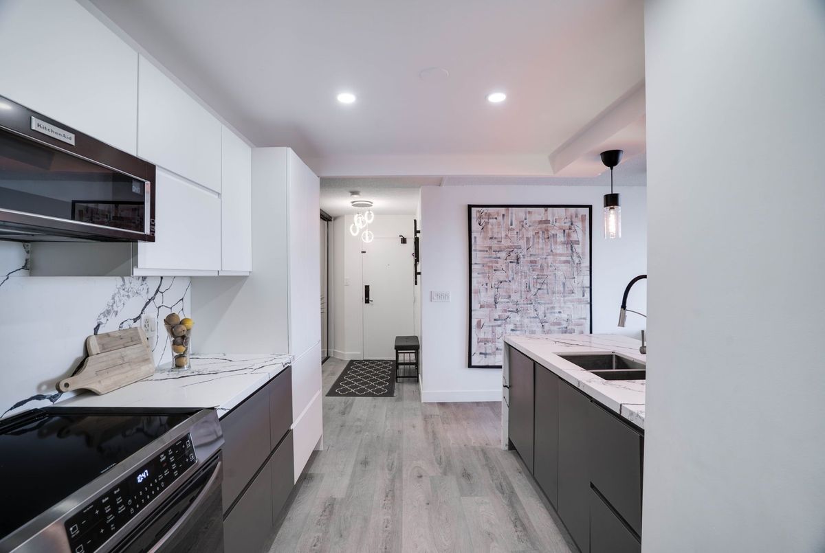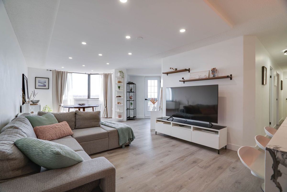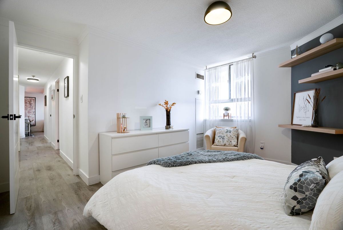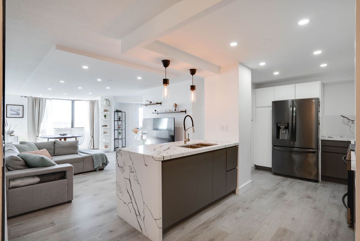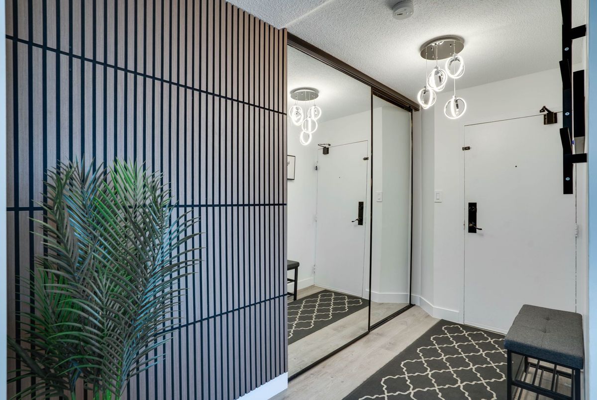 Stunning 3-Bedroom Condo | $$$ in Renovations | Scenic Balcony Views. Welcome to this meticulously upgraded 1,244 sq. ft. condo, where contemporary design meets modern elegance! With top-tier craftsmanship renovations, this 3-bedroom, 2-bathroom home in the heart of Elms-Old Rexdale, Toronto is a true showstopper. Step inside and be captivated by the open-concept layout, boasting a modern kitchen featuring sleek quartz countertops, a spacious peninsula with a double sink and seating area, custom cabinetry, and premium stainless-steel appliances. The living and dining area is an entertainers dream, enhanced by pot lights, a striking coffered ceiling, expansive bay window, and seamless access to the large balcony where you can unwind and soak in the picturesque views of West Humber Recreational Trail and Humber Valley Golf Course. Retreat to the comfort of the primary suite, complete with a walk-in closet and updated ensuite bathroom. The two additional bedrooms offer generous space, while the renovated main bathroom exudes style and sophistication. Enjoy the convenience of an ensuite laundry room with a full-size side by side washer and dryer. The brand-new electrical panel will ensure modern efficiency and bring you peace of mind. Nestled in a prime location, you'll have easy access to transit, shopping, dining, entertainment and great schools. Building Features a exterior pool, sauna & gym .Don't miss your opportunity to view this gem. Schedule your private showing today!